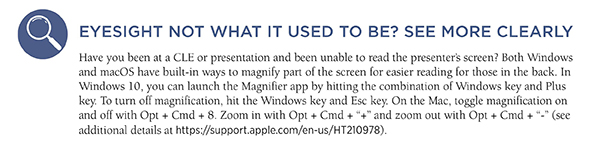 Have you been at a CLE or presentation and been unable to read the presenter’s screen? Both Windows and macOS have built-in ways to magnify part of the screen for easier reading for those in the back. In Windows 10, you can launch the Magnifier app by hitting the combination of Windows key and Plus key. To turn off magnification, hit the Windows key and Esc key. On the Mac, toggle magnification on and off with Opt + Cmd + 8. Zoom in with Opt + Cmd + “+” and zoom out with Opt + Cmd + “-“ (see additional details at https://support.apple.com/en-us/HT210978).