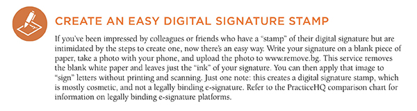 If you’ve been impressed by colleagues or friends who have a “stamp” of their digital signature but are intimidated by the steps to create one, now there’s an easy way. Write your signature on a blank piece of paper, take a photo with your phone, and upload the photo to www.remove.bg. This service removes the blank white paper and leaves just the “ink” of your signature. You can then apply that image to “sign” letters without printing and scanning. Just one note: this creates a digital signature stamp, which is mostly cosmetic, and not a legally binding e-signature. Refer to the PracticeHQ comparison chart (https://tcms.njsba.com/PersonifyEbusiness/Resources/PracticeHQ/ComparisonCharts.aspx) for information on legally binding e-signature platforms.