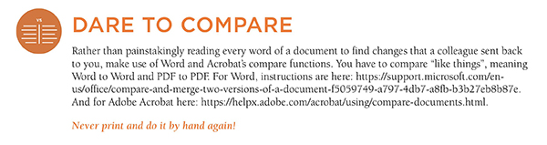Rather than painstakingly reading every word of a document to find changes that a colleague sent back to you, make use of Word and Acrobat’s compare functions. You have to compare “like things”, meaning Word to Word and PDF to PDF. For Word, instructions are here: https://support.microsoft.com/en-us/office/compare-and-merge-two-versions-of-a-document-f5059749-a797-4db7-a8fb-b3b27eb8b87e. And for Adobe Acrobat here: https://helpx.adobe.com/acrobat/using/compare-documents.html. Never print and do it by hand again!