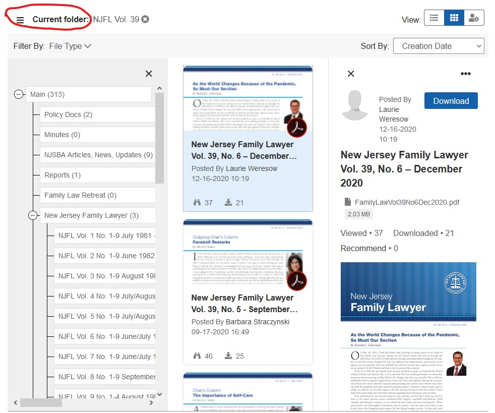 * To the left, choose the hamburger icon to open or close the view of all the library folders. Click on a particular folder to view those files.