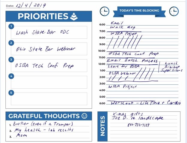 As a 20+ year paperless lawyer & consultant, as much as I love technology, I am a huge fan of using some form of paper for planning. One great tool is a paper-based planning journal. Keep it open, next to your keyboard all day, so you can look at it when you have the urge to check email 75 times! Here is an example of my TDC (Tame the Digital Chaos) Daily Planning Journal: