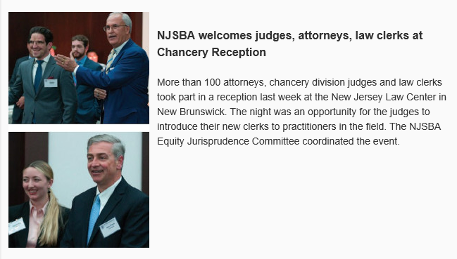 More than 100 attorneys, chancery division judges and law clerks took part in a reception last week at the New Jersey Law Center in New Brunswick. The night was an opportunity for the judges to introduce their new clerks to practitioners in the field. The NJSBA Equity Jurisprudence Committee coordinated the event.